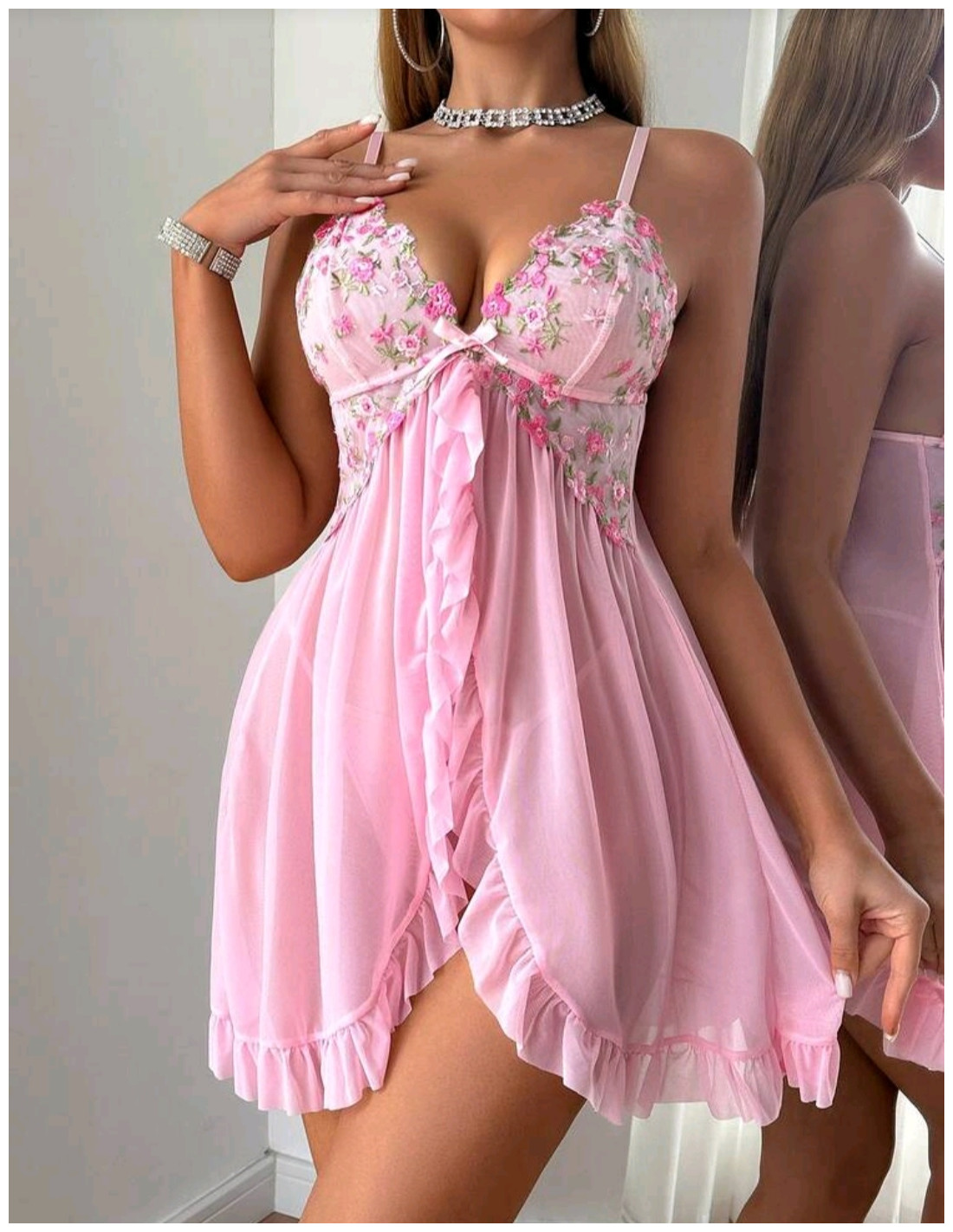Delicado babydoll en tono rosado con fino bordado floral y caída ligera que envuelve el cuerpo con suavidad. Un diseño romántico y elegante, pensado para realzar tu feminidad con sutileza y lujo.